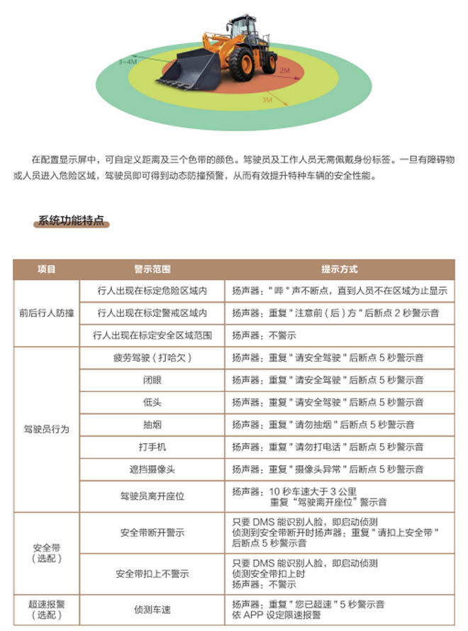 特種車輛智能識別防撞預(yù)警系統(tǒng)是專為工程車輛叉車、裝載機、挖掘機、推土機、礦山港口移動車輛設(shè)備所設(shè)計的智能識別防撞預(yù)警安全裝置,能夠?qū)崟r偵測工作區(qū)域的危險狀態(tài)并提供警示,有助于提升預(yù)防工程特種車輛作業(yè)安全。一旦有障礙物或人員進入危險區(qū)域,駕駛員可得到動態(tài)防撞預(yù)警并發(fā)出報警進行實時減速或停車,該系統(tǒng)能在各種復(fù)雜廠區(qū)路況及工礦環(huán)境中幫助駕駛員避免危險,預(yù)防事故發(fā)生減輕壓力,提供豐富的駕駛員輔助環(huán)境感知等功能